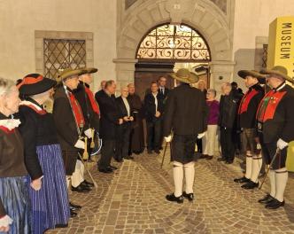 Einheimische und Schaulustige erwarteten bereits nach dem Gottesdienst am Oberen Pfarrplatz die Formationen der Meraner Schützen mit ihren Fahnenabordnungen aus dem historischen Tirol, die wie gewohnt Aufstellung zum Festakt nahmen. Mit dabei als Ehrengäste: Merans Bürgermeisterin Dr. Katharina Zeller, Stadtrat Christoph Mitterhofer, der Obmann des A.Hofer Bundes Hermann Unterkircher sowie Vertreter von Kirche und ehrenamtlicher Vereine. Umrahmt durch den Musikeinsatz von Musikanten der Bürgerkapelle Obermais wurde traditionell von den Meraner Schützen ein Ehrensalutschuss für verstorbene Mitglieder der Kompanie abgefeuert. Thomas, Wirt vom Lokal „Luisl`s Keller“ am Pfarrplatz Meran spendierte den Meraner Schützen erneut eine Fahne für den Pulverturm, die bei einer „Schnapsl- Ausgabe“ feierlich entgegengenommen wurde. Im Nikolaussaal wurden den Gästen bei einem festlichen Essen Bilder von Veranstaltungen und Ausrückungen der Meraner Schützen vom vergangenen Jahr präsentiert. Leutnant Patrick Mitterhofer nahm die Ehrung für seine 20 jährige Zugehörigkeit mit Urkunde und goldenem Ehrenzeichen entgegen. Ebenso wurden Jungschützen der Meraner Kompanie für erfolgreiche Teilnahme an Wettbewerben belobigt und ihnen für eine Spendenaktion für eine in Not geratene Familie gedankt. Alt- Dekan Albert Schönthaler übernahm das Tischgebet, Dekan Mario Gretter, Bürgermeisterin Katharina Zeller und Altbürgermeister der Stadt Meran Günther Januth überbrachten Grußworte an Schützen und die zahlreichen Gäste. Ein spezieller Schützen-Dank ging an die Laurin Stiftung, vertreten durch ihren Mitarbeiter Walter Stirner, der sich erfolgreich für eine großzügige Spende der Stiftung zur Beschaffung von neuen Schützentrachten für die Kompanie einsetzen konnte. Renato des Dorides, Hauptmann der Meraner Schützen, verabschiedete sich nach 25 Jahren Aktivitäten im Schützenwesen und bedankte sich bei Freunden und Kameraden der Kompanie für die Arbeit im Gremium der Kommandantschaft, der Referenten, bei allen Schützenkameraden, Jungschützen und Marketenderinnen für die langjährige Zusammenarbeit.