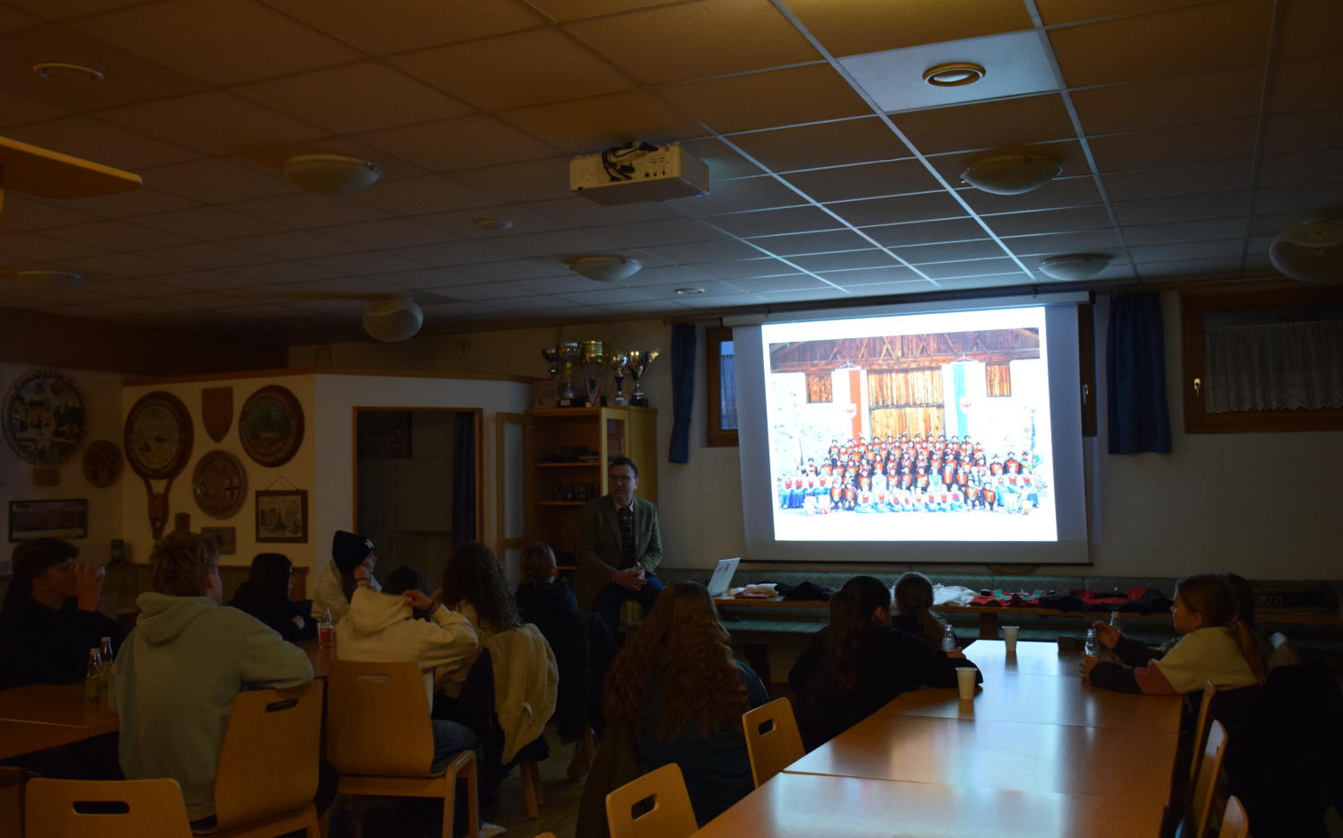 Im Anschluss ging es weiter ins Schützenheim, wo bereits unser ehemaliger Bezirksmajor Andreas Leiter Reber auf uns wartete. Als Mitglied der „Arbeitsgemeinschaft Lebendige Tracht“ brachte er uns die Geschichte und Besonderheiten der Burggräfler Trachten näher. Vom „Wollehemat“ bis zum „Tschoap“ lernten wir nicht nur die Namen der einzelnen Trachtenteile kennen, sondern auch deren richtige Pflege und wie sie richtig getragen wird. Ein großes Dankeschön an Andreas für seine Zeit und sein wertvolles Wissen, das er uns mit auf den Weg gegeben hat.