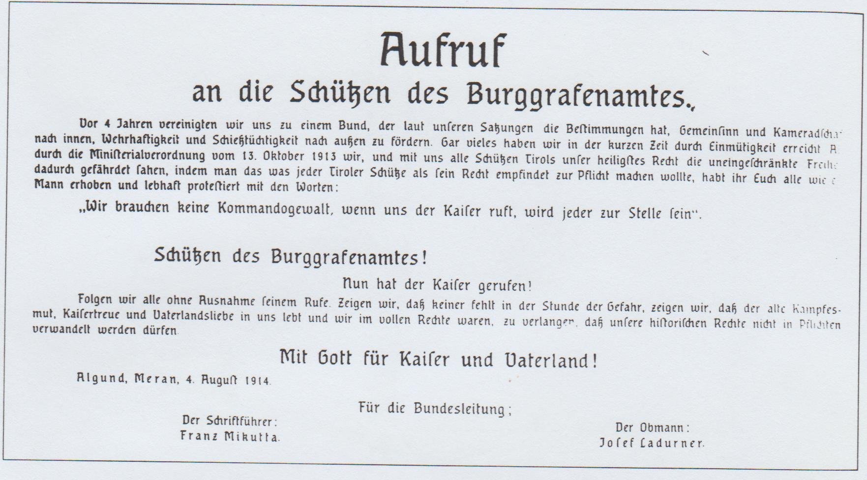 Auf die Schüsse, die am 28. Juni den Thronfolger Franz Ferdinand und seine Gattin töteten, kam als furchtbares Echo der 1. Weltkrieg, der ganz Europa verdunkelte, und an dessen Folgen wir heute noch leiden. Am 29. Juli erließ der Kaiser ein Kriegsmanifest („An meine Völker“). Die allgemeine Mobilmachung der gesamten bewaffneten Macht wurde am 2. August ausgerufen. Alle hofften auf einen kurzen Krieg. Am 26. August wurden die noch verbliebenen Schützen einberufen, zu Standschützenbataillonen vereinigt und vereidigt. Vorerst stellte das Burggrafenamt 3 Bataillone, und zwar Meran, Lana und Passeier. An der Feldmesse und dem Zeremoniell nahmen auch die Veteranenvereine von Meran und Mais teil.