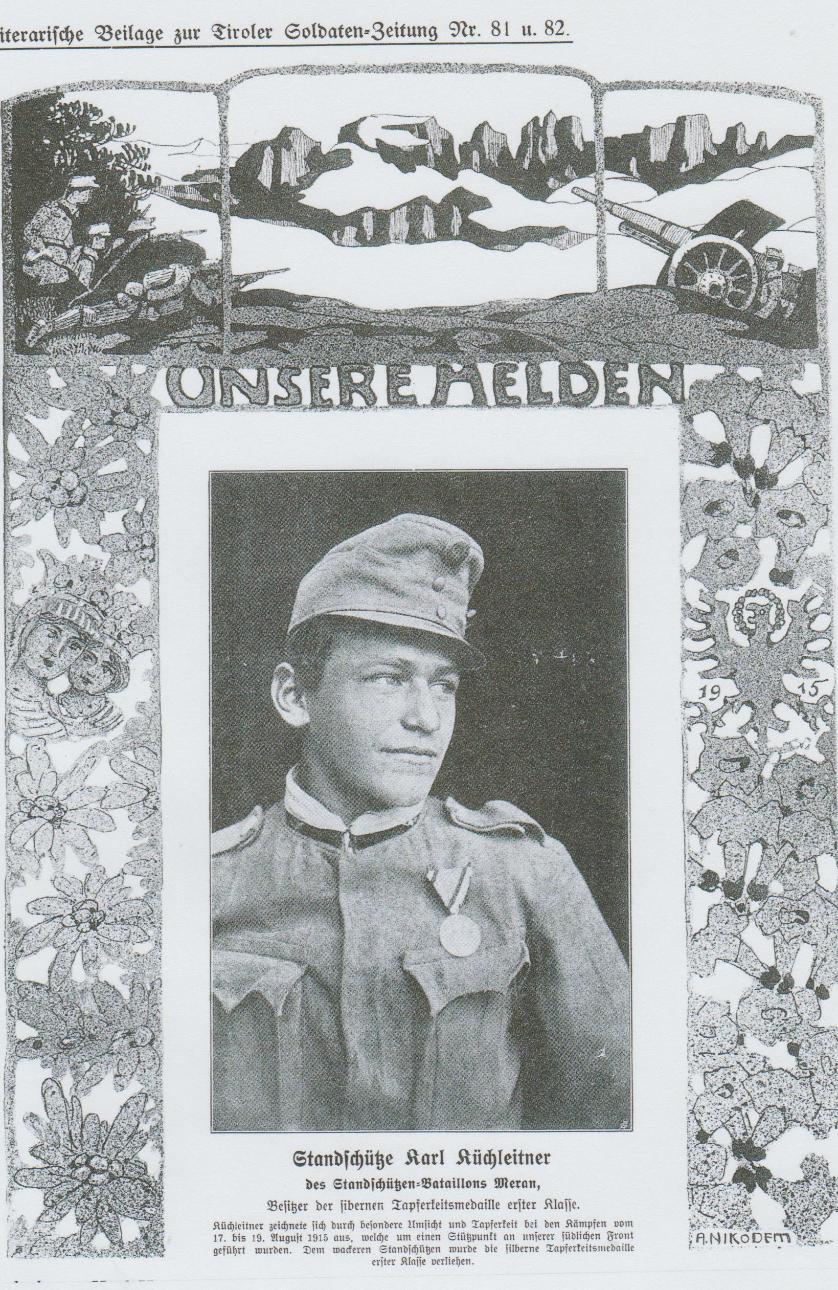 1915 – Im August hatte man noch Hoffnungen und Erwartungen gehegt („Zu Weihnachten seid ihr zu Hause“), doch diese erfüllten sich nicht. Österreich war wieder einmal völlig unzureichend gerüstet in einen Krieg eingetreten, diesmal in einen Weltkrieg. Gleich zu Beginn wurden nicht nur die vier Kaiserjägerregimenter an die russische Front geworfen, sondern auch die drei Landesschützen- und die die zwei Landsturmregimenter, Spezialisten im Hochgebirge und wertvollste Verteidigungstruppen. Außerdem wurden nach kürzester Zeit 35 Marschbataillone – bedingt durch die hohen Verluste – nachgesandt.