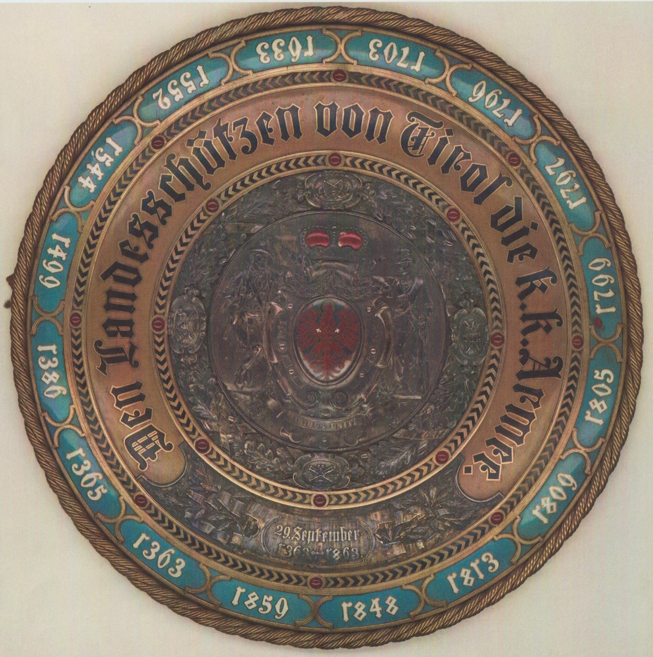 In einer eigenen Feier überreichte die österreichische Armee den Schützen Tirols einen silbernen Ehrenschild für Treue und Tapferkeit. Es dürfte einmalig sein, dass die Armee eines großen Reiches dem Volksaufgebot eines kleinen Landes in Anerkennung seiner Kriegsleistungen ein solches Ehrenzeichen widmet.
