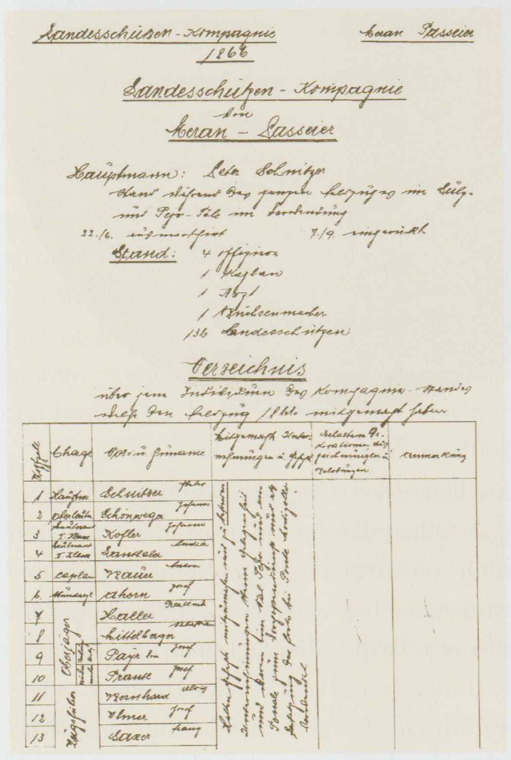 1859 – Kaiser Franz Josef I., der im Revolutionsjahr den Thron bestiegen hatte, sowie seien Minister und Ratgeber hatten offenbar aus 1848 nichts dazugelernt: Fast 10 Jahre regierten sie mit absoluter Herrschergewalt. Es gab keinen österreichischen Reichstag mehr, und in Tirol wurde die 1848 eingeführte fortschrittliche Landesverfassung wieder außer Kraft gesetzt. Ebenso vernachlässigte man im Überlegenheitsgefühl der Siege von 1848/49 die Ausrüstung der Armee und erst recht die Tiroler Landesverteidigung. Als im Frühjahr die Gefahr eines Krieges gegen Sardinien/Piemont und Frankreich unmittelbar bevorstand, erließ man in aller Eile eine provisorische „Landesverteidigung für Tirol und Vorarlberg“. In Tirol gab es keinerlei kaiserliche Truppen, und in letzter Minute rief Kaiser Franz Josef die Tiroler auf, zum Schutz der Landesgrenzen zu den Waffen zu greifen. Durch den voreiligen Rückzug der österreichischen Armee nach der Schlacht bei Magenta (4. Juni) ins Festungsviereck Mantua-Peschiera-Verona-Legnago blieb der Südwesten Tirols vollkommen ungeschützt. Der Landeshauptmann appellierte an die Tiroler, sofort mindestens 20 Kompanien an die Grenzen zu schicken. Es braucht Zeit, ohne jede Vorbereitung eine einsatzbereite Kompanie aus dem Boden zu stampfen, doch die Kompanie Meran rückte als erste des Landes bereits am 13. Juni aus. Sie bezog am Stilfser Joch Stellung. Kompanien aus Lana, Ulten und Algund folgten, ebenso eine zweite aus Meran, Mais und Partschins. Diese sperrte den Tonalepass. Es kam zu keinen Gefechten, nur zu kleineren Plänkeleien mit italienischen Banden. Bis zum 30. Juni waren bereits 40 Kompanien ausgerückt, sie wurden aber bald in ihre Heimatorte entlassen, da Kaiser Franz Josef am 8. Juli den Waffenstillstand von Villafranca schloss. Das alte Reichslehen Lombardei war verloren, und Tirol grenzte nun im Westen an das neue Königreich Italien. Die Kompanien, die als erste ausgezogen waren, erhielten eine vom Landeshauptmann gestiftete Medaille für ihre Fahnen.