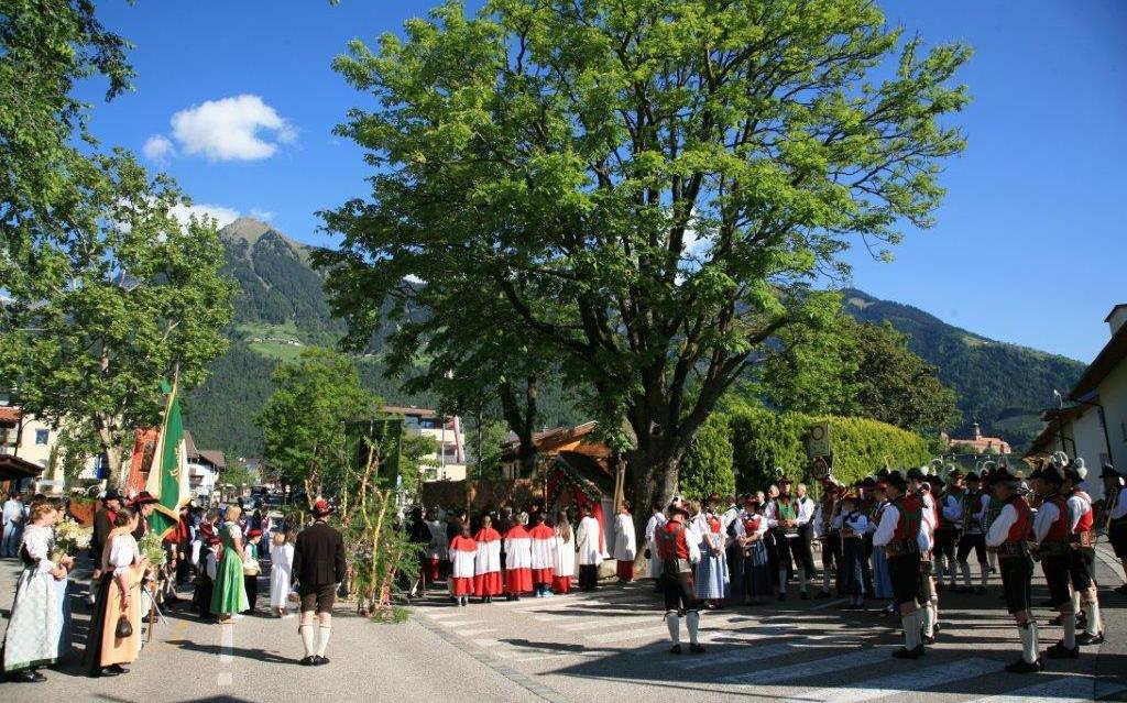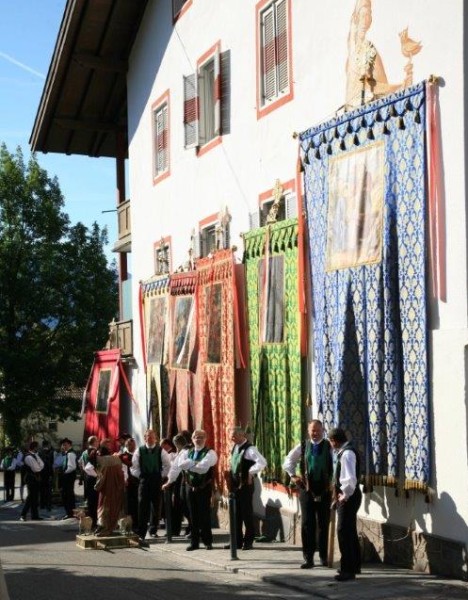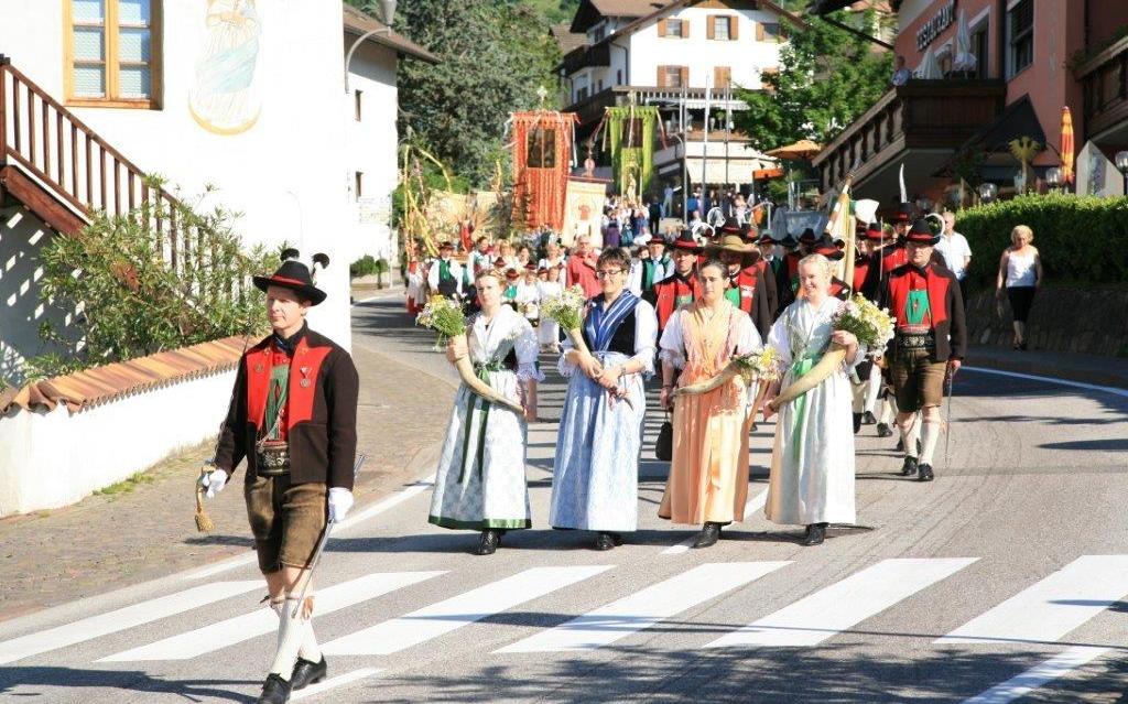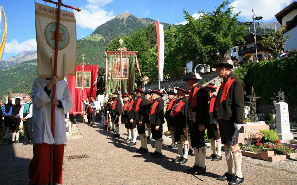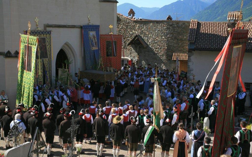 Neben der festlichen Beflaggung, den zahlreichen Fahnenträgern und Ministranten, den aufmarschierenden Schützen und der Musikkapelle, tragen vor allem die zahlreichen Gläubigen in ihrer Burggräfler Tracht, zur farbenfrohen Festlichkeit dieses Feiertages bei.
