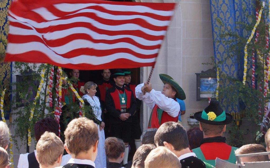 Im Anschluss an die Prozession und unter den Klängen der Musikkapelle, zeigt auf dem Tiroler Kirchplatz der Fahnenschwinger sein Können.