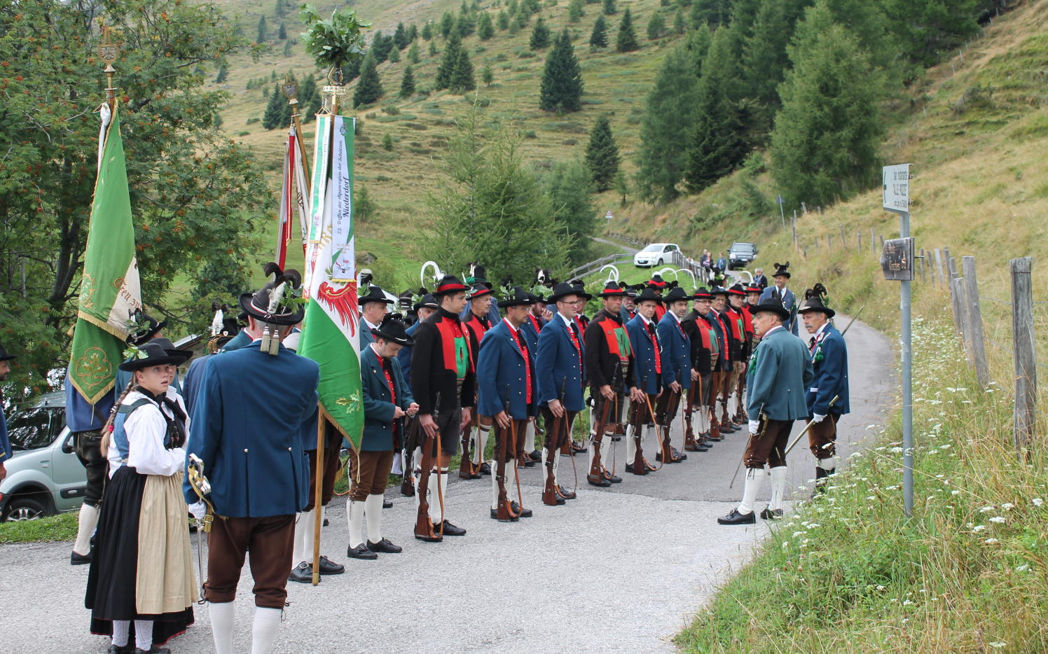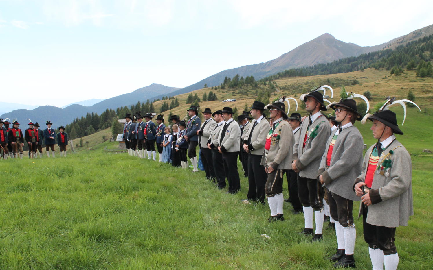 Die Malga Colo liegt auf der orografisch linken Seite des Valsugana – Tales auf ca. 1740 m Meereshöhe und ist von den Ortschaften Roncegno Terme und Ronchi über eine Forststraße bequem mit dem PKW zu erreichen. So fanden sich dort pünktlich um 10:00 h die Abordnungen aus dem Lechtal, aus dem Zillertal, aus Alpach und aus Algund ein, um zusammen mit der gastgebenden Schützenkompanie Telve die Gedenkfeier abzuhalten.