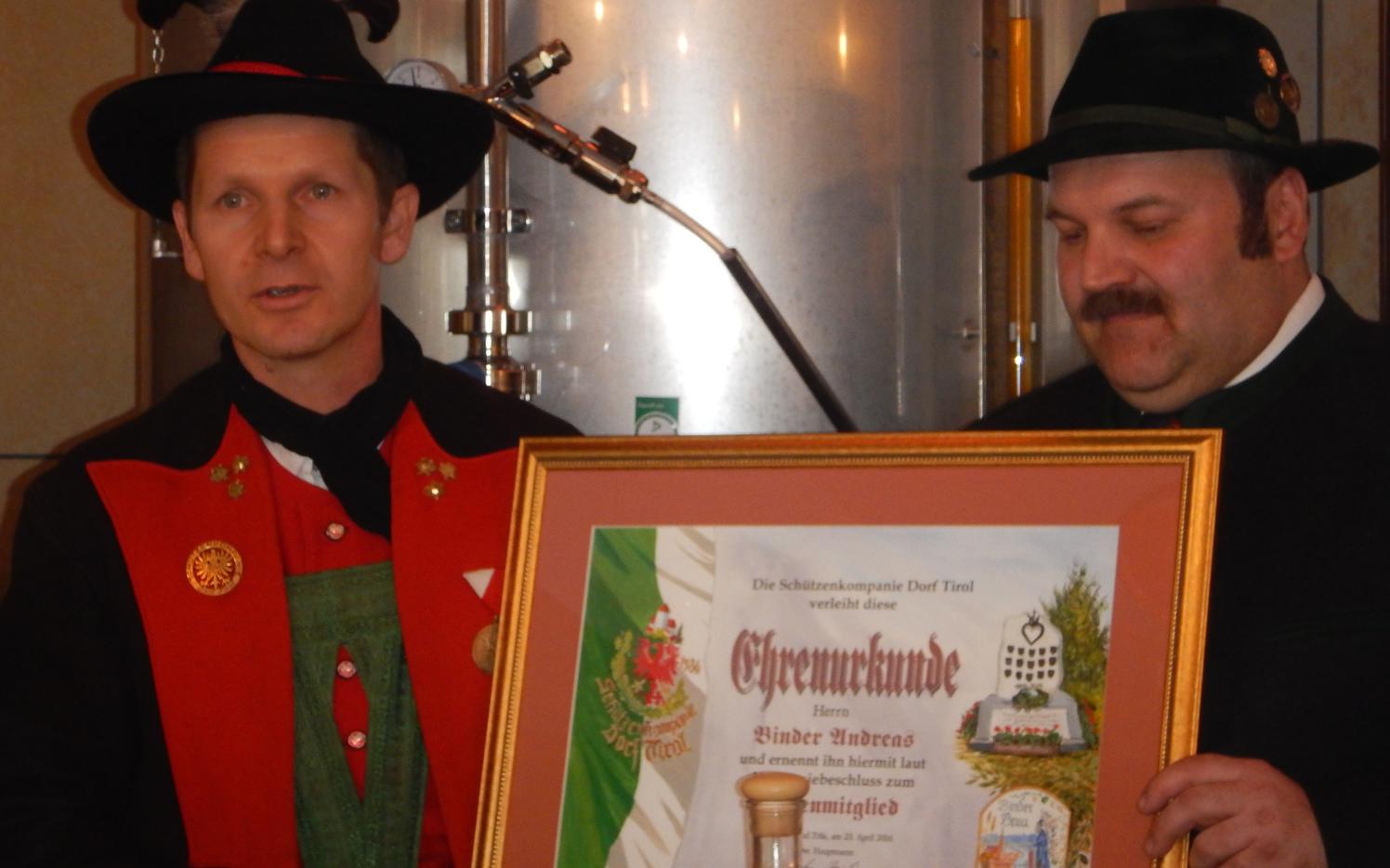 So unterstützte der gelernte Steinmetz die Kameraden bei der Planung und Ausführung des Gedenksteins am Segenbühel maßgeblich. 2008 und 2009 reiste er deshalb mehrmals nach Südtirol um das Vorhaben zu unterstützen. Er modellierte die Wappen und das Herz in Wachs und brachte es in die Bronzegießerei in den Bayrischen Wald. Ausserdem half er beim Aufbau der Ausstellung zu „50 Jahre Gefallenendenkmal Dorf Tirol“. Seit dem findet ein reger Austausch statt und Andreas half wo er konnte. Für seinen Einsatz um die Kameradschaft und das Schützenwesen, ganz im Zeichen von “Früher Feinde heute Freunde“, verlieh ihm die Schützenkompanie die Ehrenmitgliedschaft.