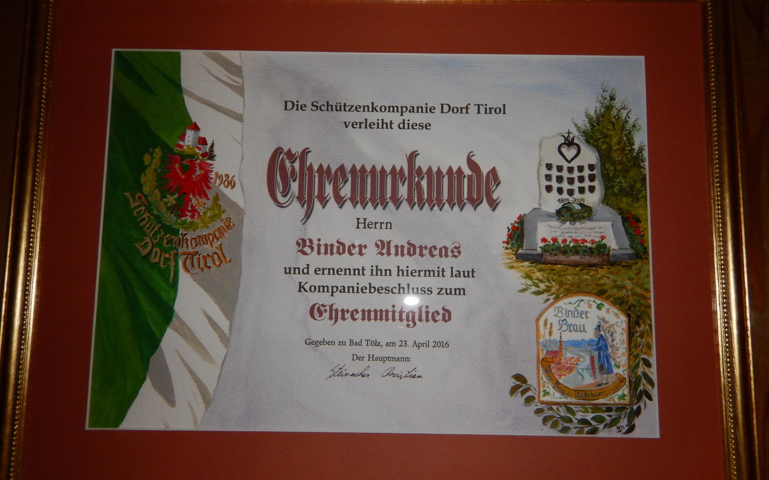 Im Jahr 2004 feierte die Schützenkompanie Dorf Tirol ihre 25ig Jährige Wiedergründungsfeier. Dazu kamen viele Schützen und Marketenderinnen aus nah und fern. Unter den Festgästen befand sich auch die Gebirgsschützenkompanie Bad Tölz, unter dem Kommando von Josef Riesch. Sie waren der Einladung gefolgt um den früheren Austausch zwischen Dorf Tirol und Bad Tölz, der schon länger eingeschlafen war, wieder aufleben zu lassen. Darauf folgte die Einladung zum Leonhardiritt und verschiedene Besuche, so auch zur 50ig Jahrfeier der Gebirgsschützenkompanie Bad Tölz. Andreas Binder, damals Direktor des Stadtmuseums, war bei allen Treffen dabei und es entwickelte sich eine gute Freundschaft.