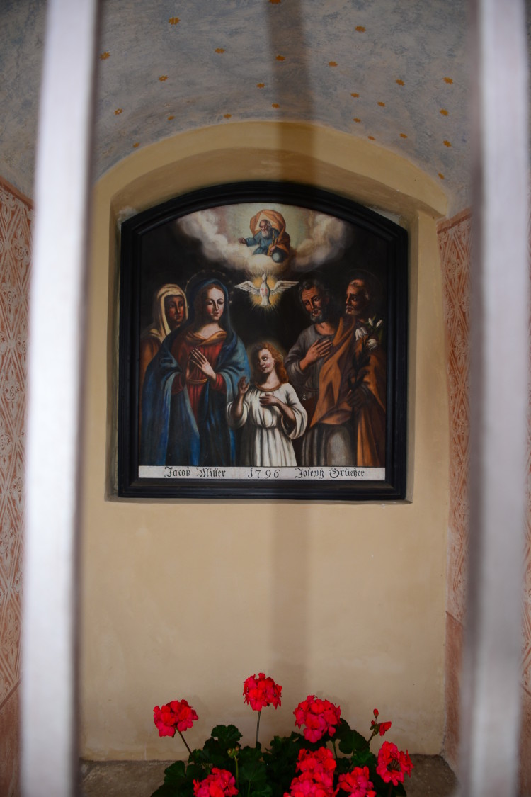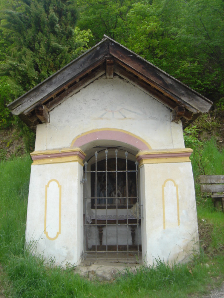 In einer Zeit, in der sich vieles rasch ändert, in der alles schneller, grenzenloser, ortloser wirkt, entsteht Bedürfnis nach Zugehörigkeit und dies wiederum ist Ausdruck von Identität und Authentizität, die sich selbst im geschichtlichen Teil des Bildstockes manifestieren. Im Barockstil erbaut, wurde er sehr bald mit einer Holztafel samt Ölgemälde geschmückt, auf welchem die Hl. Sippe, also die Eltern Marias, Hl. Anna und Hl. Joachim, die Hl. Familie, in Gestalt der Hl. Maria, des Hl. Josef und des Jesuknaben, darüber der Hl. Geist, in Form einer Taube sowie Gottvater, der über die Großfamilie wacht. Bei der letzthin durchgeführten Restaurierung wurde eine alte Schrift, die sich am unteren Bildrand befindet, freigelegt: „Jakob Miller 1796 Joseph Gruber“. Die Namen entsprechen den Eigentümern des Aichholzer- und Roemenhofes jener Zeit und die Jahrzahl könnte mit den Franzosenkämpfen in Verbindung gebracht werden. Es ist nämlich überliefert, dass sowohl im Juni 1796 am Monte Baldo die Schützenkompanie Lana mit Ulten und Tisens, unter Hauptmann Josef Rutter, als auch im darauffolgenden September am Tonale-Pass, weitere 124 Mann der Schützenkompanie Lana, unter Hauptmann Josef v. Call, erfolgreich gekämpft haben. Möglich ist, dass beide Hofbesitzer aus Dankbarkeit und zum Gelöbnis die kleine Kapelle errichten ließen.