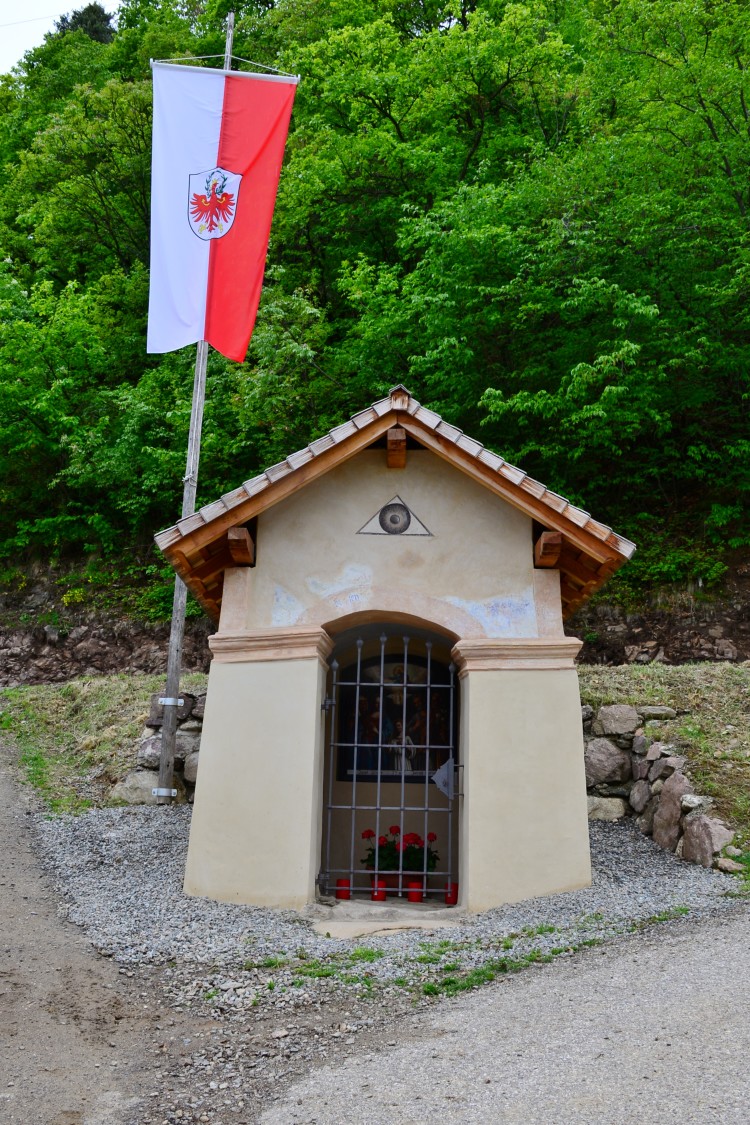 Bild - Rainmann-AichholzEin erstes schriftliches Zeugnis dieses Kleindenkmals liefert die Beschreibung Oswalds Menghin anfangs des 20. Jahrhunderts. Die Namen Josef Unterholzner und Michael Gruber sowie die Jahrzahl 1882, IHS, INRI und Silovasio waren seinerzeit gut ersichtlich, wobei er letzteren Namen als jenen eines welschen Restaurators annahm. Er wies zudem darauf hin, dass an dieser Stelle eine ältere Schrift durchgeschienen habe. Das Gewölbe zierte ein Sternenhimmel, in dessen Mitte der Hl. Geist in Form einer Taube dargestellt war. An den Wänden waren die Leidenssymbole Christi wie Kreuz, Dornenkrone und Nägel aufgemalt. Am Mauerbogen stand mit rötlicher Farbe „Gelobt sei Jesus Christus 1882“ geschrieben, darüber war das Auge Gottes dargestellt.