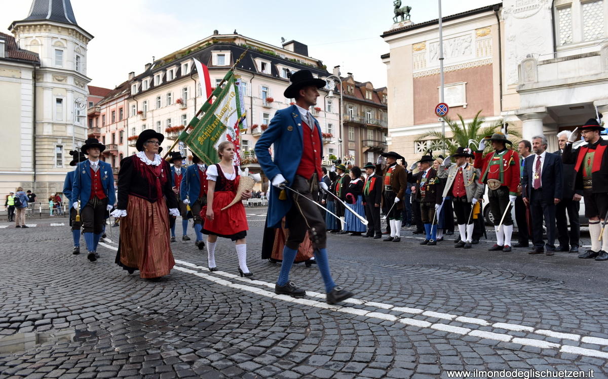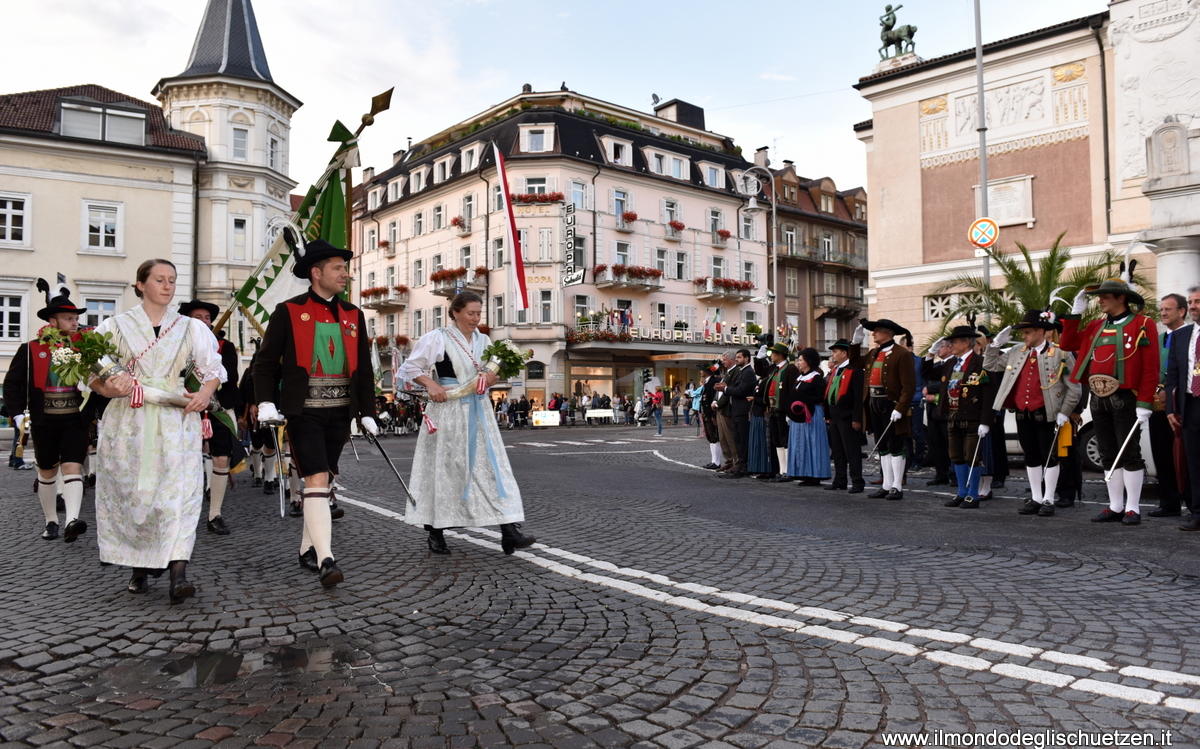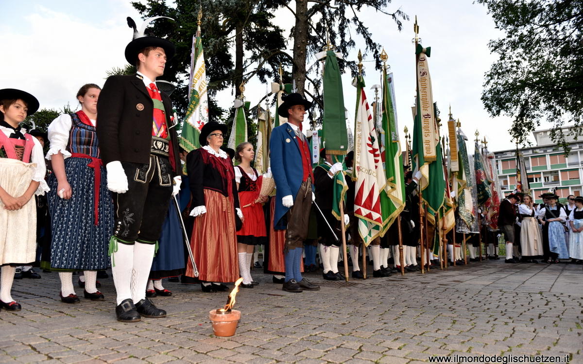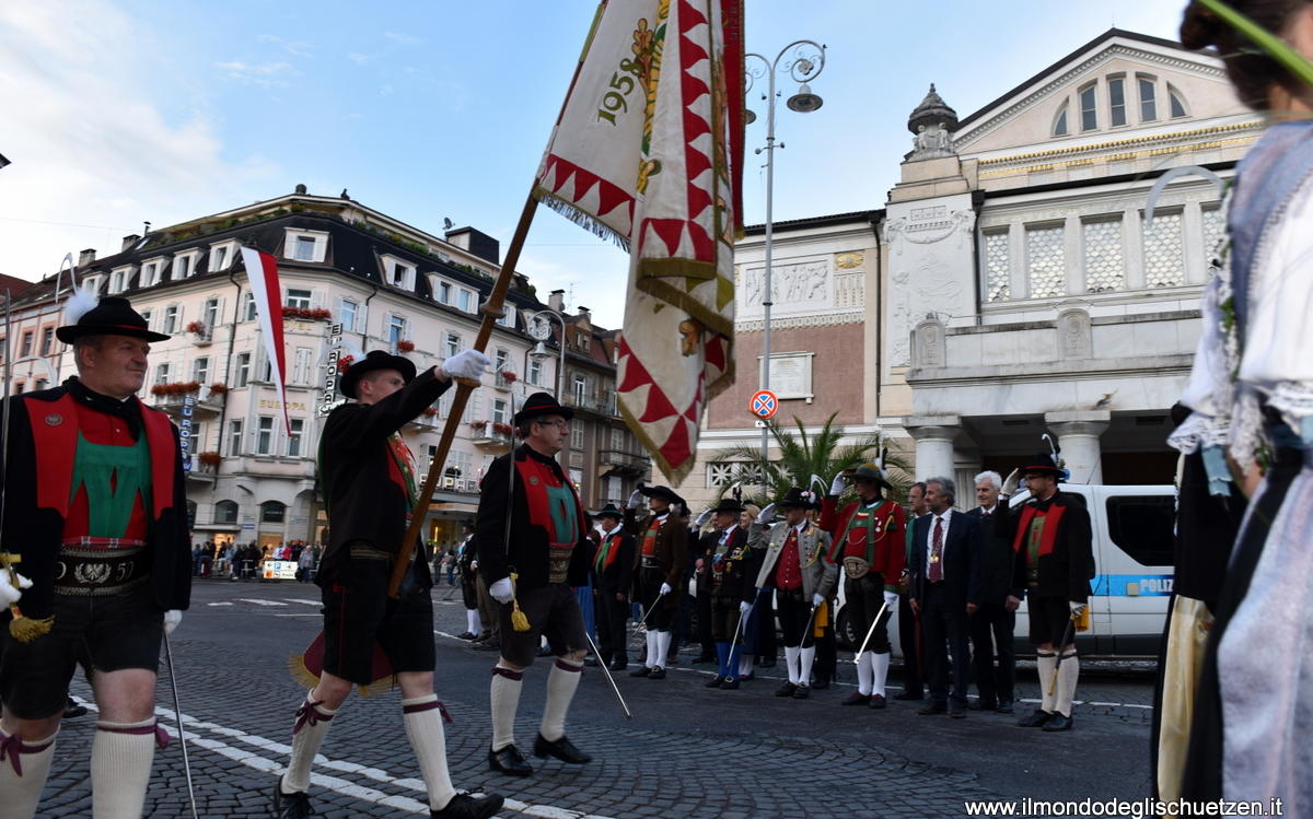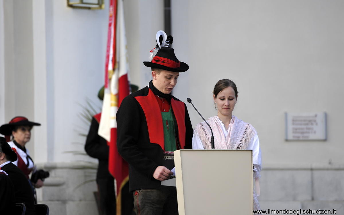 Ein junger Schütze und eine Marketenderin begrüßten im Namen des Bezirks, neben dem Meraner Bürgermeister und Ehrenschutz Paul Rösch, zahlreiche Schützenoffiziere und Vertreter des öffentlichen Lebens
