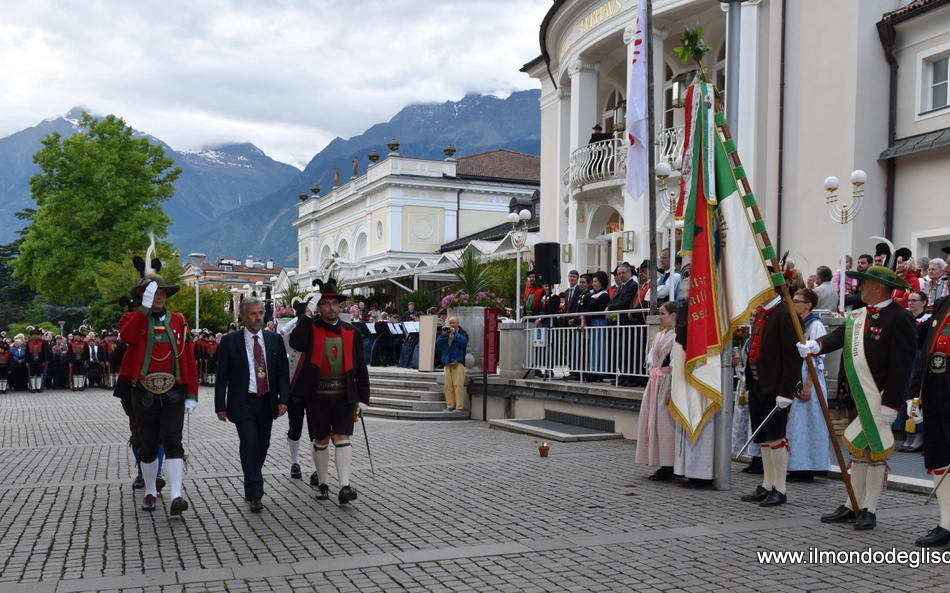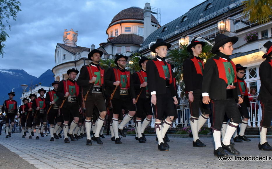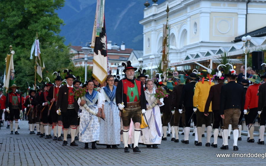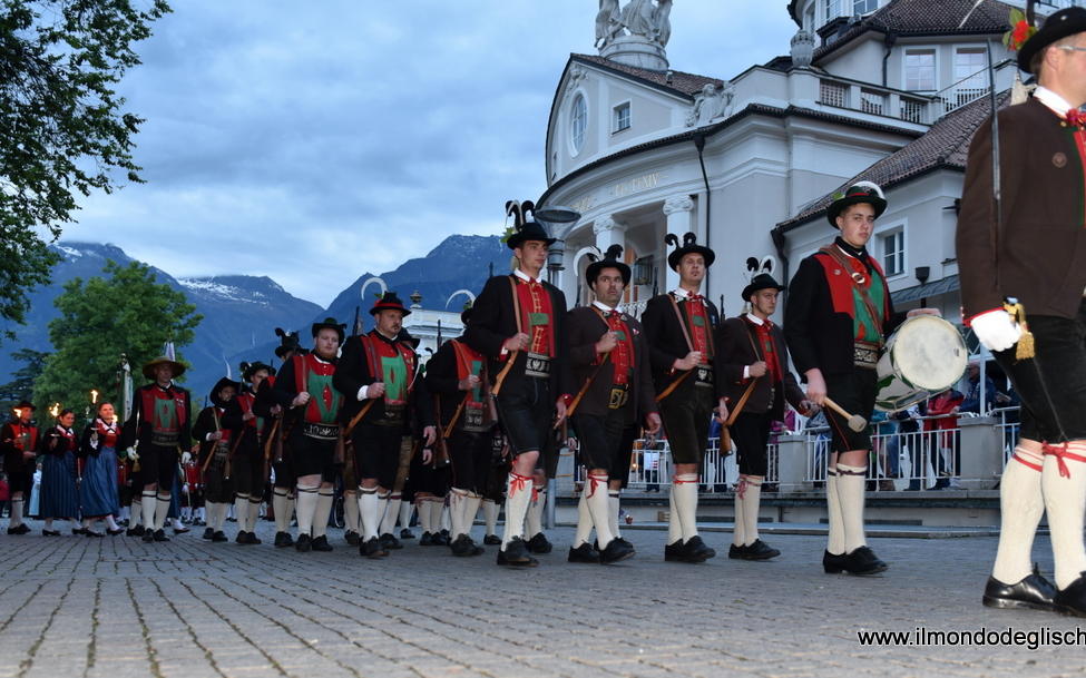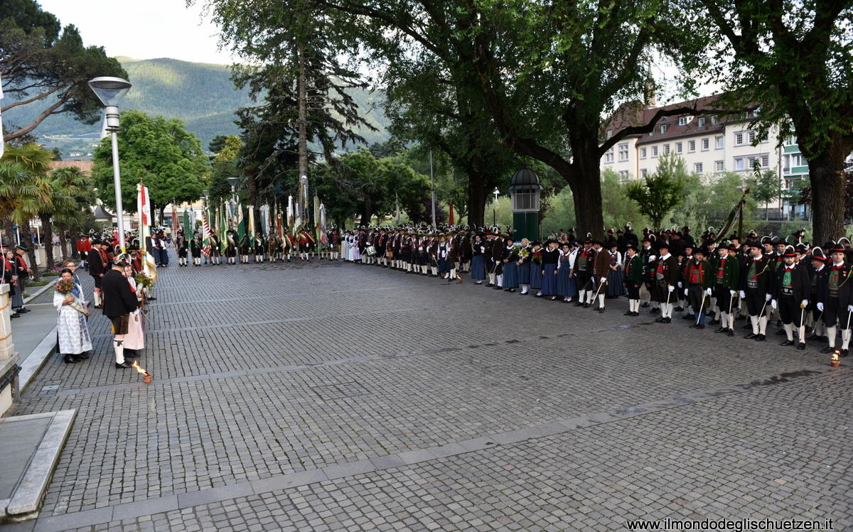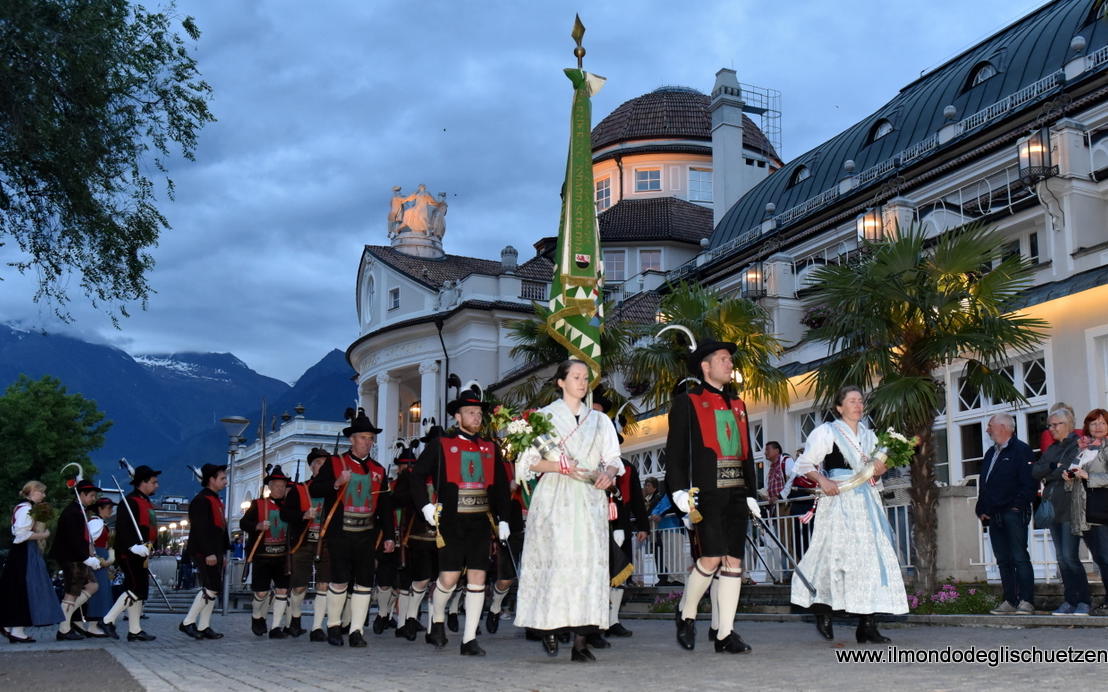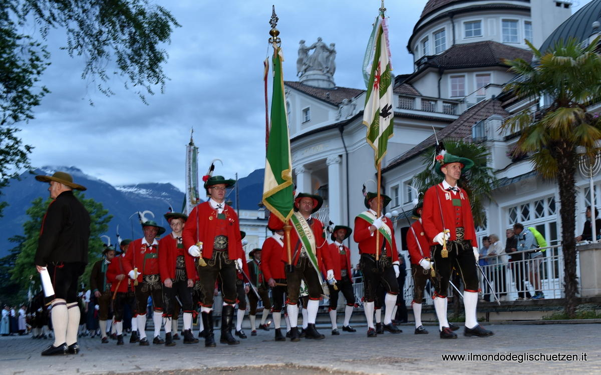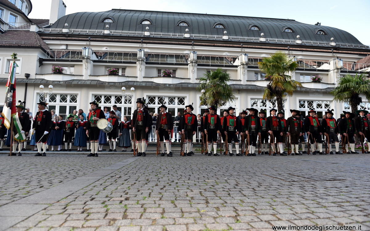 Höhepunkt des Bezirksfest war die abendliche Aufführung des Tiroler Zapfenstreichs vor dem Meraner Kurhaus. Während rund 800 Schützen aus allen Tiroler Landesteilen auf der Passerpromenade ein Karree bildeten, wohnten zahlreiche Ehrengäste und Zuschauer auf den Kurhausterrassen der Aufführung bei.