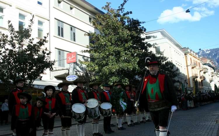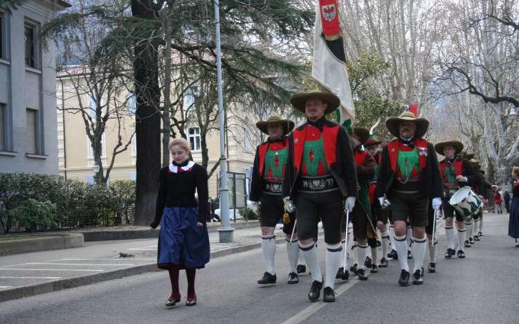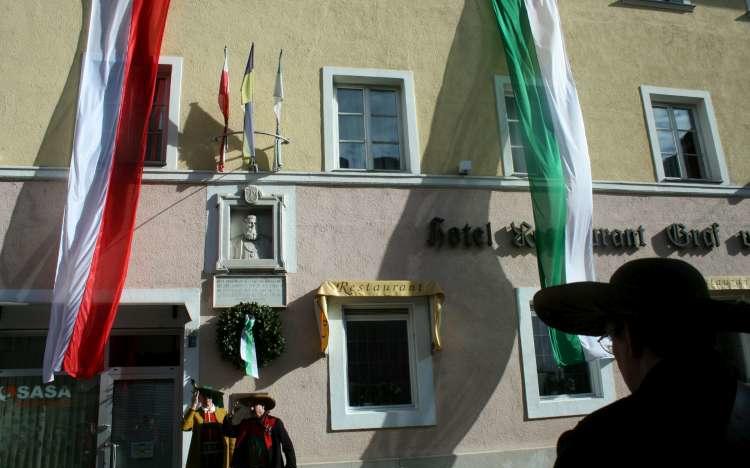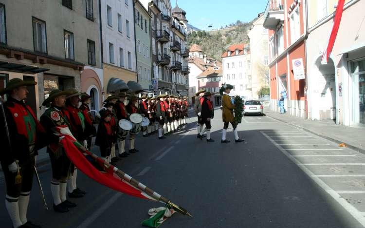 Nach der Formationsaufstellung am Pfarrplatz marschierten die Meraner Schützen zum historischen Platz beim heutigen Hotel „Graf von Meran“, in dem Andreas Hofer nach seiner Gefangennahme im Jahr 1810 von französischen General Huard wiederholt verhört und anschließend verhaftet wurde. Nach einer kurzen Geschichtsinformation durch Hauptmann Renato des Dorides wurde bei Trommelwirbel und Präsentieren der Gewehre ein Gedenk-Kranz der Schützenkompanie Meran vor dem Marmor-Relief angebracht.