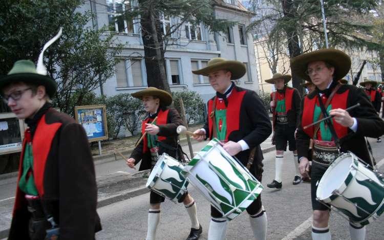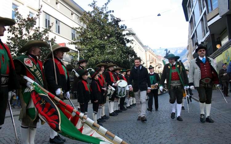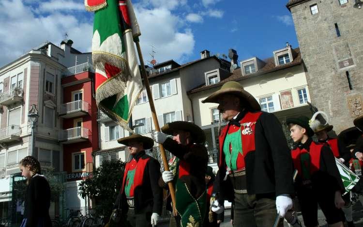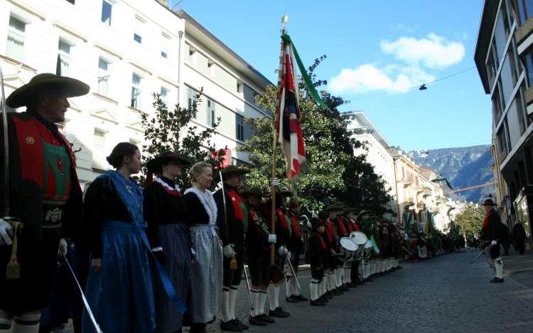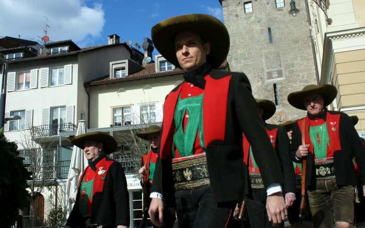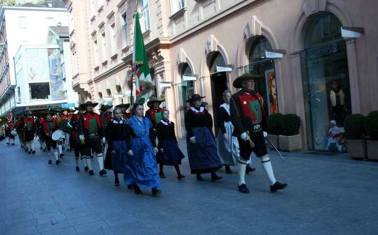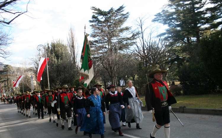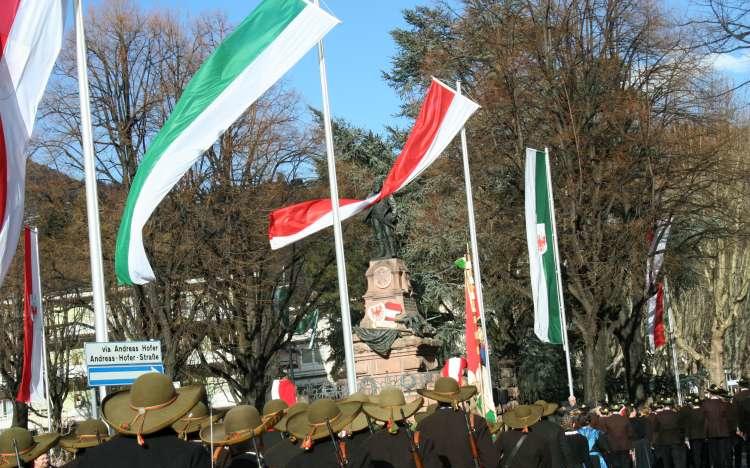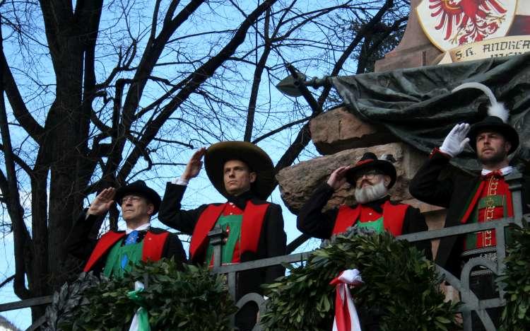 Anschließend stellte sich die Ehrenformation der Schützenkompanie Meran an der Freiheitsstraße mit den dort bereits eingetroffenen Schützenformationen aus allen Tiroler Landesteilen auf. Nachdem die lange Front der Schützenverbände durch die Landeskommandanten der Schützenbünde mit Ehrengast Felix Baumgartner abgeschritten war, erfolgte der Abmarsch zum „Andreas Hofer-Denkmal“.