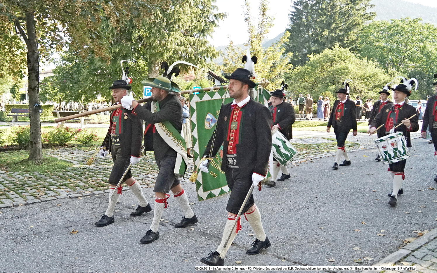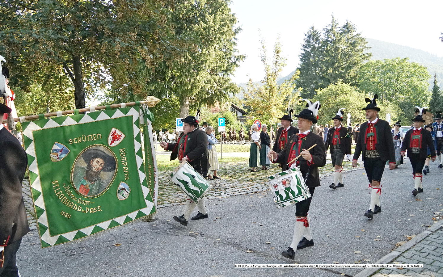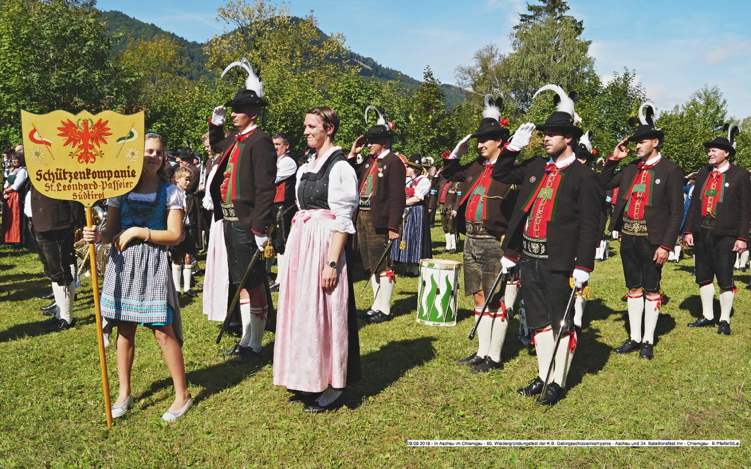 Schützen der SK Andreas Hofer – St. Leonhard und der SK Major Georg Klotz – Walten sowie Musikanten der MK Andreas Hofer – St. Leonhard und der MK Walten feierten mit der Königlich-Bayrischen Gebirgsschützenkompanie Aschau im Chiemgau ihr 60 jähriges Wiedergründungsfest. Gleichzeitig trafen sich die Schützen der Alpenregion zum 34. Bataillonsfest Inn – Chiemgau.