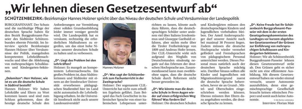 BURGGRAFENAMT – Erst kürzlich hat das Südtiroler Tagblatt „Dolomiten“ ein Interview mit dem Bezirksmajor des Schützenbezirkes Burggrafenamt/Passeier, Hannes Holzner, veröffentlicht, in welchem dieser eine klare Position zum Schulsystem in Südtirol und zu manch einem Gesetzesentwurf, der mehrsprachige Schulen vorsieht, bezieht.