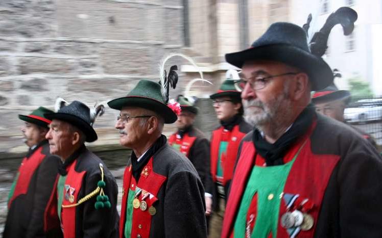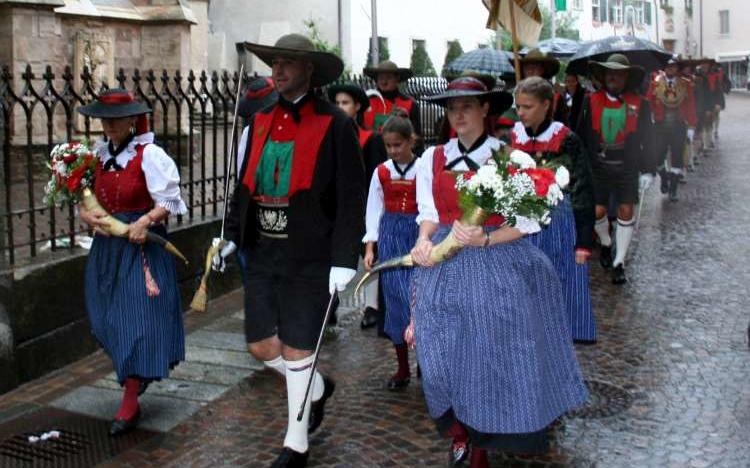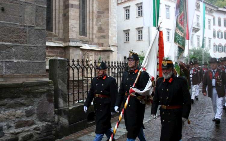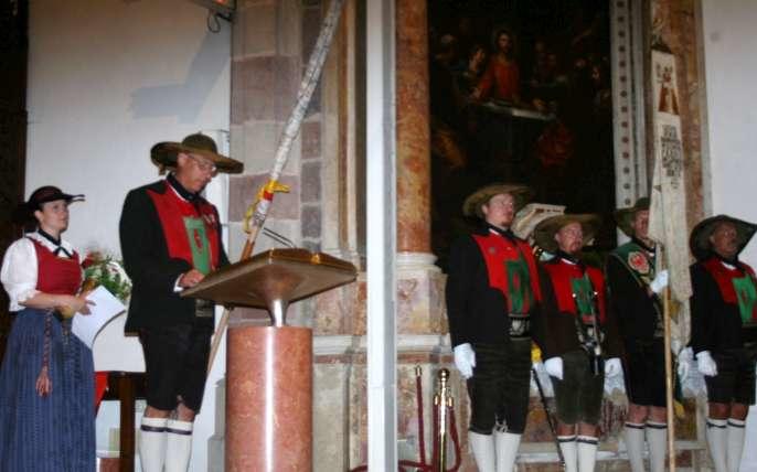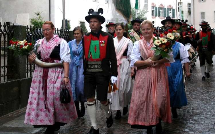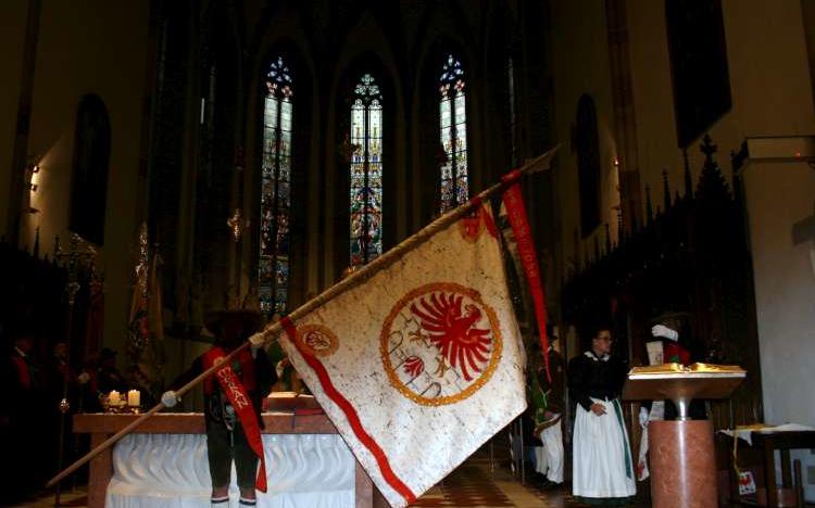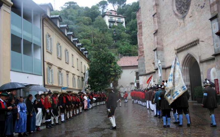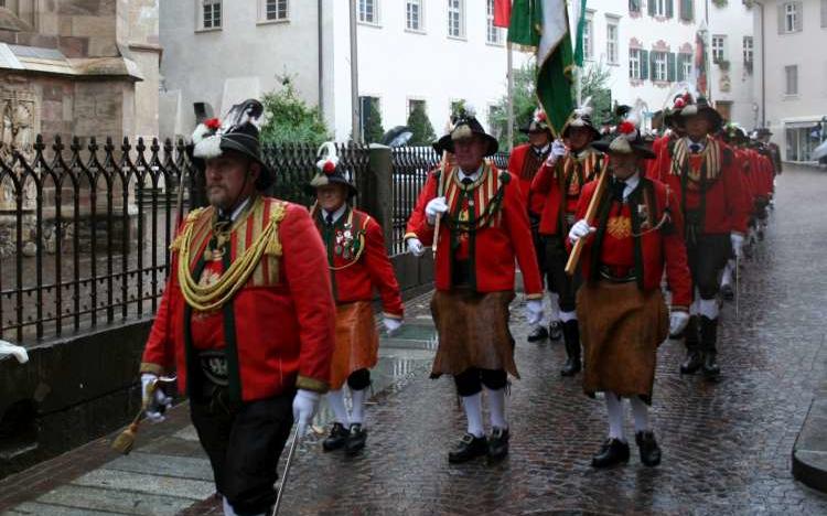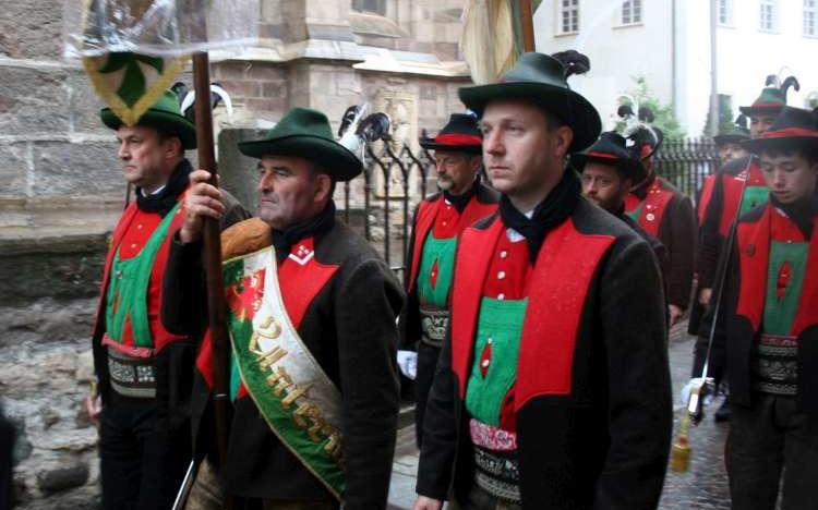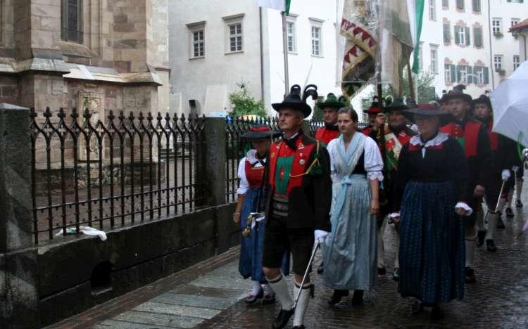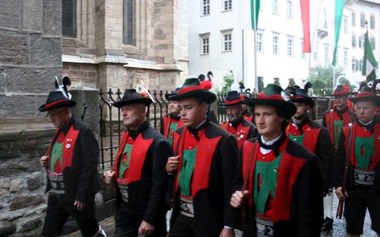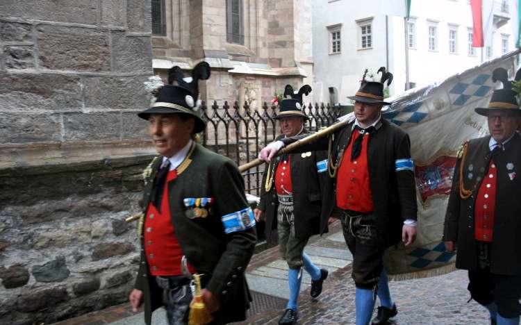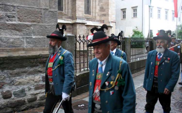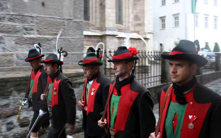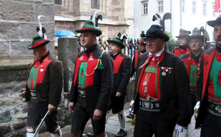 Schlechte Witterung verlangte dem Hauptmann der Jubelkompanie Meran Lukas Prezzi einiges an Programmänderung und Improvisation ab. Eine gemischte Formation aus Tal-Kompanien vom Bezirk Burggrafenamt/Passeier unter dem Kommando von Hptm. Thomas Egger (SK Schenna) bildete die Ehrenkompanie. Nach der Aufstellung am Meraner Pfarrplatz marschierten die Schützen – begleitet von der Stadtmusikkapelle Meran – zur Stadtpfarrkirche St. Nikolaus zum Festgottesdienst – zelebriert von Pater Martin Steiner OT. In den Mittelpunkt seiner Predigt stellte er ein Zitat, das am „Philosophenweg“ im bayr. Garmisch Partenkirchen zu lesen ist: „Dankend zurückschauen, mutig vorausschauen, gläubig aufwärts schauen und liebend seitwärts schauen…!“