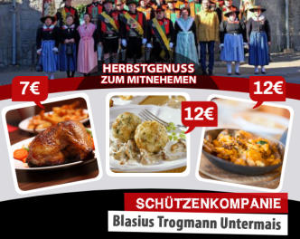 BURGSTALL – Die Schützenkompanie „Graf Volkmar von Burgstall“ veranstaltet am Samstag, 23.10., einen „Gigger Tag“. Auf Vorbestellung kann man die gegrillten Fest-Gigger beim Sparkasse Pakplatz in Burgstall abholen oder im Gemeindegebiet von Burgstall liefern lassen. Infos siehe Flugblatt!