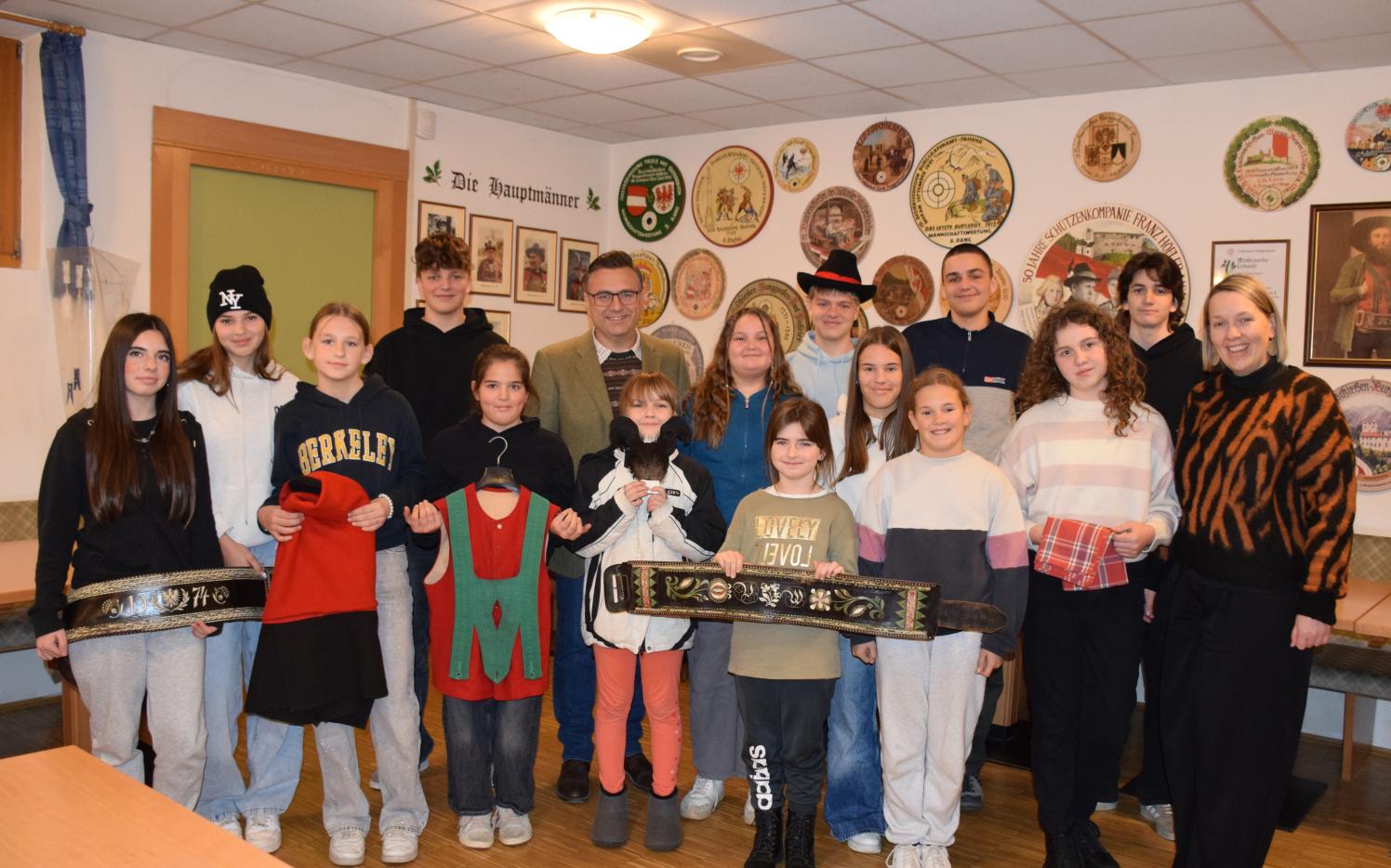 Im Anschluss ging es weiter ins Schützenheim, wo bereits unser ehemaliger Bezirksmajor Andreas Leiter Reber auf uns wartete. Als Mitglied der „Arbeitsgemeinschaft Lebendige Tracht“ brachte er uns die Geschichte und Besonderheiten der Burggräfler Trachten näher. Vom „Wollehemat“ bis zum „Tschoap“ lernten wir nicht nur die Namen der einzelnen Trachtenteile kennen, sondern auch deren richtige Pflege und wie sie richtig getragen wird. Ein großes Dankeschön an Andreas für seine Zeit und sein wertvolles Wissen, das er uns mit auf den Weg gegeben hat.