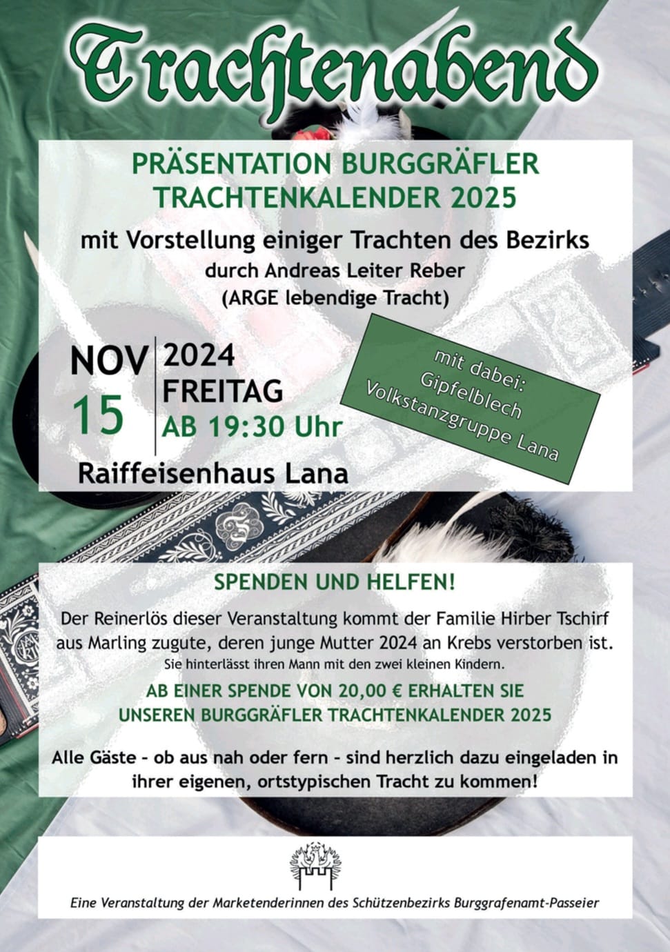 Der Marketenderinnenausschuss freut sich, euch den Burggräfler Trachtenkalender mit Informationen zu verschiedenen Männertrachten des Bezirks zu präsentieren. Die ersten Exemplare gibt es beim Trachtenabend am 15. November 2024 im Raiffeisenhaus Lana.